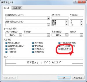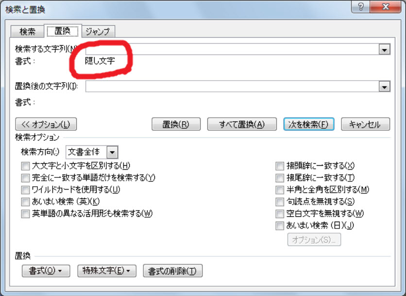 上記の設定により、検索する文字列の書式が「隠し文字」となっているはずです(下図参照)。