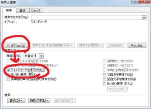 1.「検索と置換」ダイアログボックスにて、[オプション] ボタンをクリックして、[ワイルドカードを使用する] のチェックボックスをオンにします。