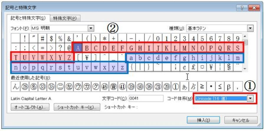 上図のように、右下のコード体系を Unicode (16進) に設定してください。