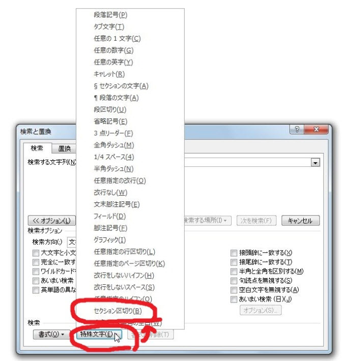 2.カーソルを [検索する文字列] の欄において、[特殊文字] ボタンをクリックします。