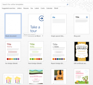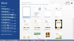 Word 2013の場合、いつもの白い「文書1」が開かずに、この画面が現れるのです(以下の画像は、Word 2013 英語版です。)