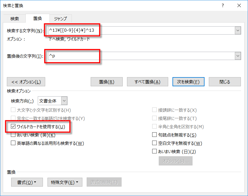 [検索と置換]ダイアログボックスのオプションを表示し、[ワイルドカードを使用する]をオンにします。
