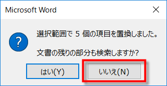 選択範囲内だけで置換が行われますので、[いいえ]ボタンをクリックしてから、[検索と置換]ダイアログボックスを閉じます。