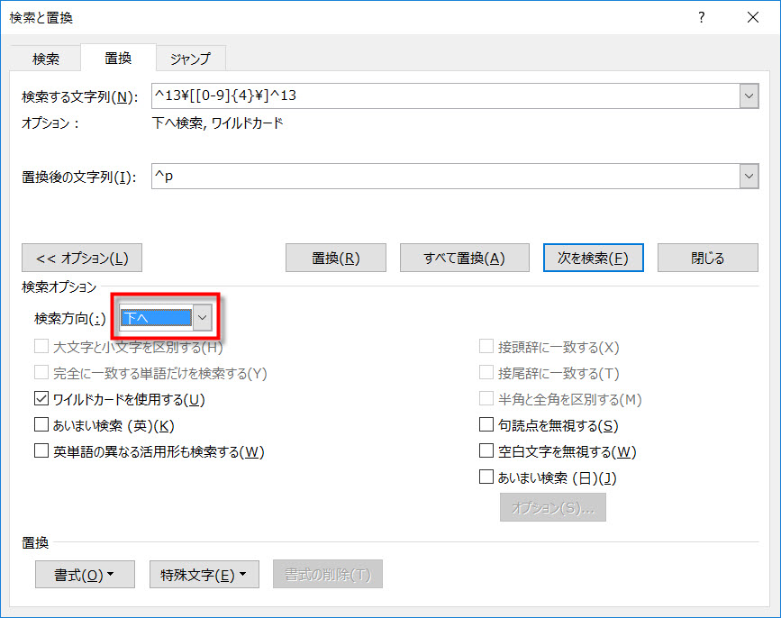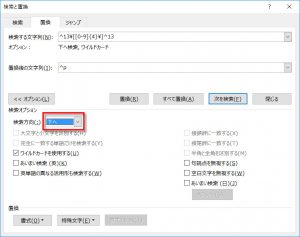 追記 16-10-19 実は上記の設定ではうまくいきません。 検索方向を[下へ]に変更してください。 ここが[文書全体]になっていると、選択範囲内のみならず文書全体で 置換をしてしまいます。