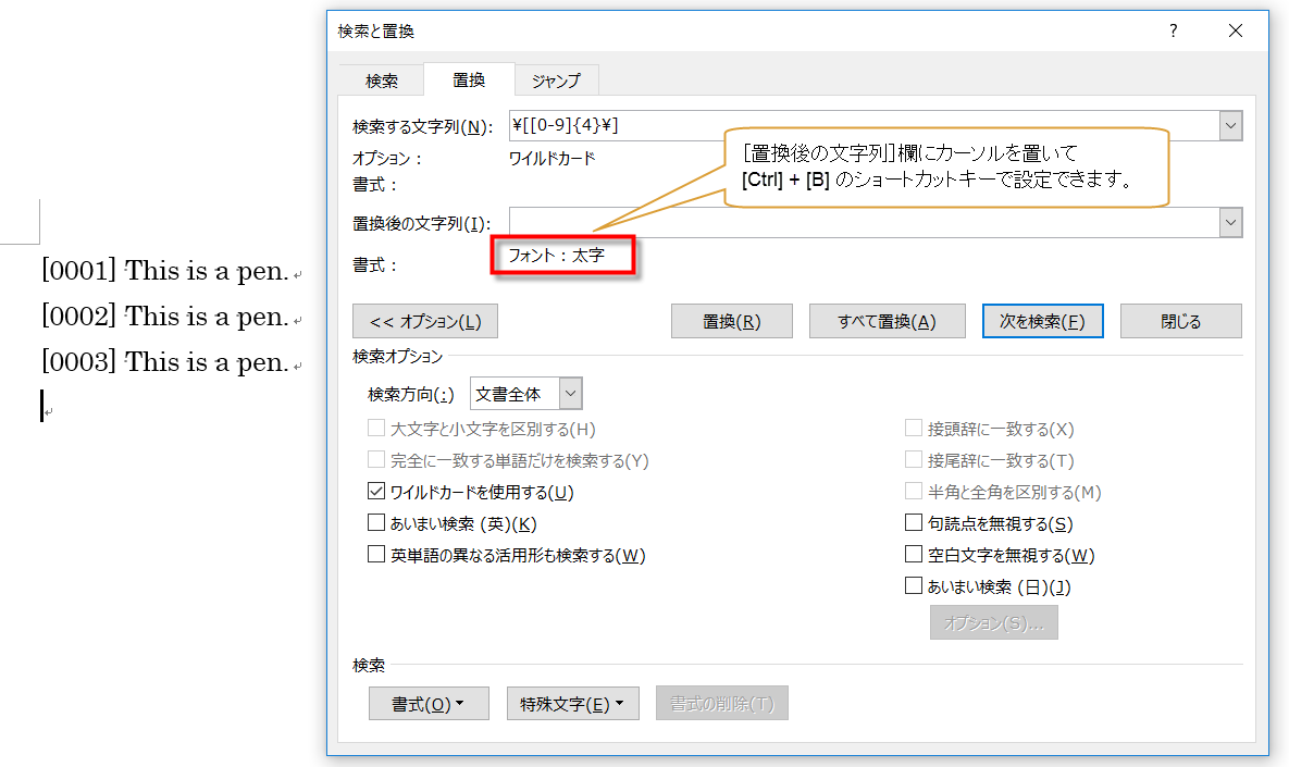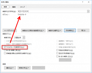 [検索する文字列]欄に上記の文字を入力して、検索オプションで[ワイルドカードを使用する]をオンにします。