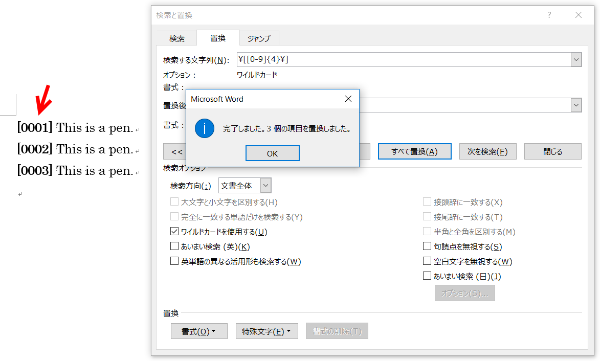 まずは、ワイルドカードを使って段落番号を検索する方法です。