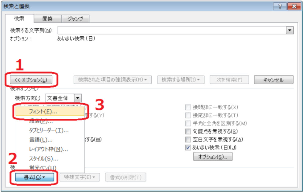 検索と置換ダイアログボックスで、①オプションボタンを押して、②書式ボタンを押して、③フォントを選択します。