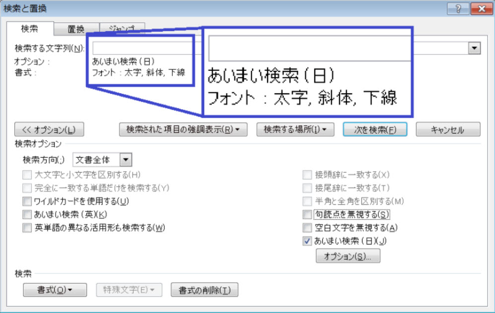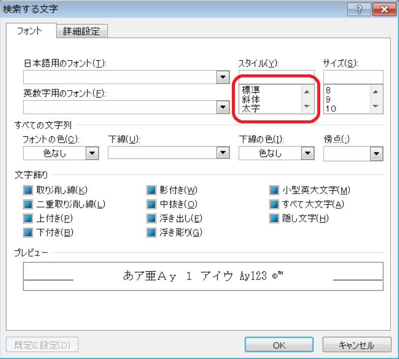 以下のダイアログボックスが表示されますから、検索対象とする文字の書式を選択することができます。
