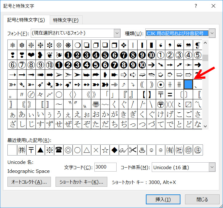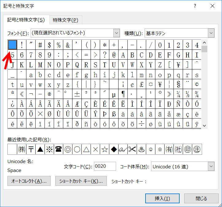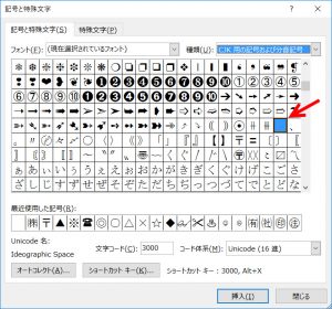 半角スペースを選択した状態で[記号と特殊文字]ダイアログボックスを立ち上げると選択した文字列の位置がわかります。