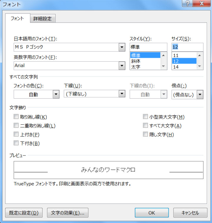 日本語と英語のフォントを変更します。ついでにフォントサイズも12ポイントにします。