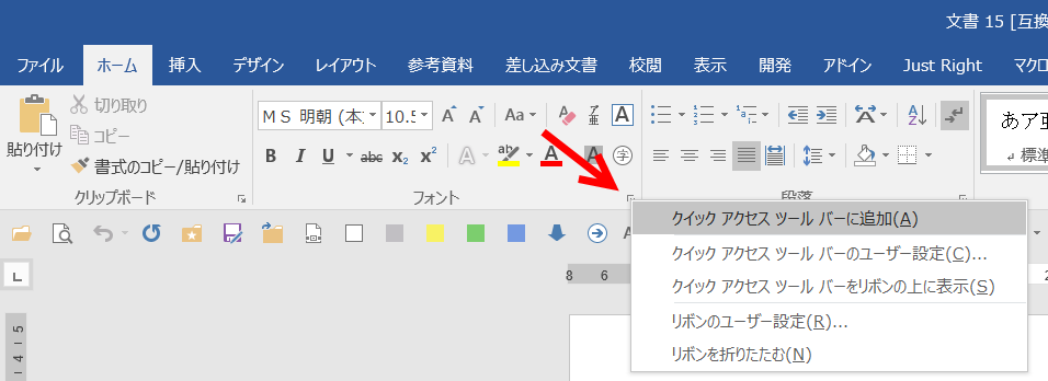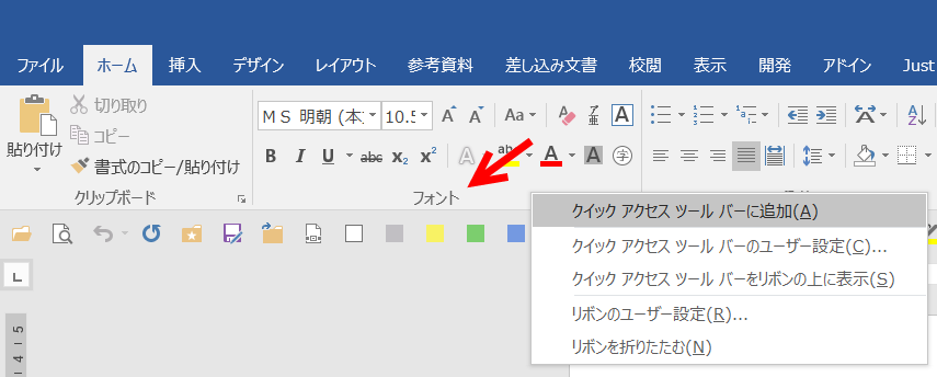 すると、[フォント]グループがクイックアクセスツールバーに追加されます。