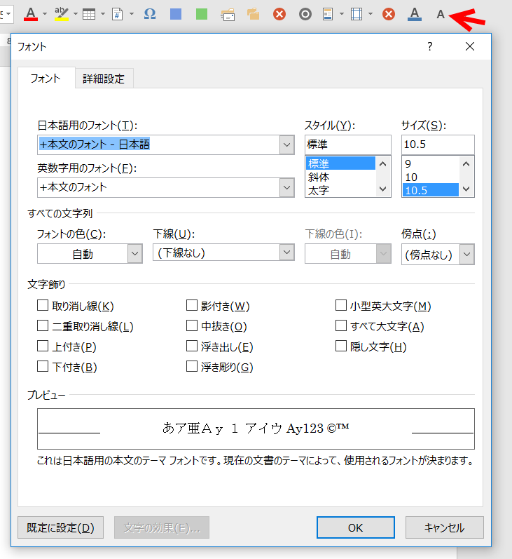 クイックアクセスツールバーの[A]というボタンから[フォント]ダイアログボックスを表示できます。