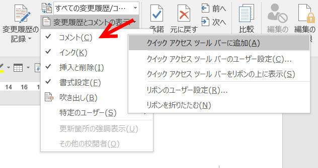[校閲]タブの[変更履歴]グループにある[変更履歴とコメントの表示]メニューの[コメント]上で右クリックをしてください。