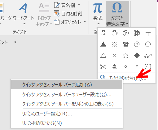 [挿入]タブの一番右端にありますよね。これも[その他の記号]上で右クリックします。