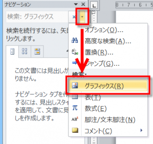 ナビゲーションウィンドウが表示されたら、検索文字列の入力欄の隣の▼ボタンをクリックして[グラフィックス]を選択します。
