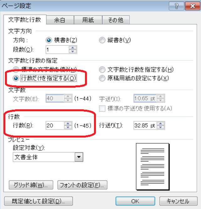 - 「ページ設定」でその文書全体の基本となるページあたりの行数を設定することと、