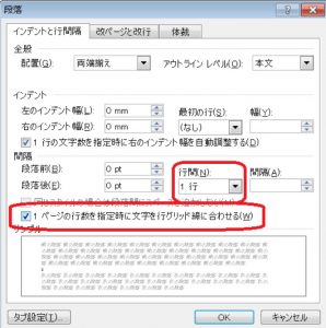 なので、上記の通り、行間を「ページ設定で指定した行数に対応した1行」に設定し、文字を「ページ設定で指定した行数に対応したグリッドにあわせる」と設定しています。