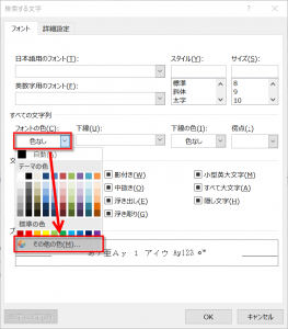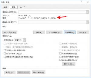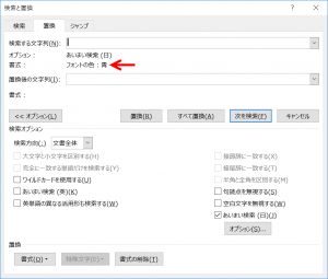 フォントの色:の欄に「青」以外の文字列が表示されます。この設定では、青色の文字を検索できませんからお気をつけください。