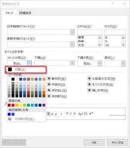 今度は、[置換後の文字列]欄にカーソルを置いて指定してから、フォントの色を指定してください。