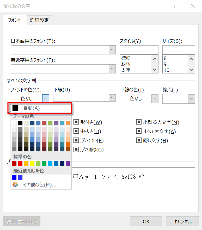 置換後の文字列のフォントの色も、上記と同様の方法で「自動」に設定します。