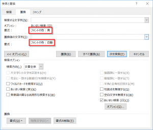 フォントの色が「青」の文字列をフォントの色が「自動」の文字列に置換します。