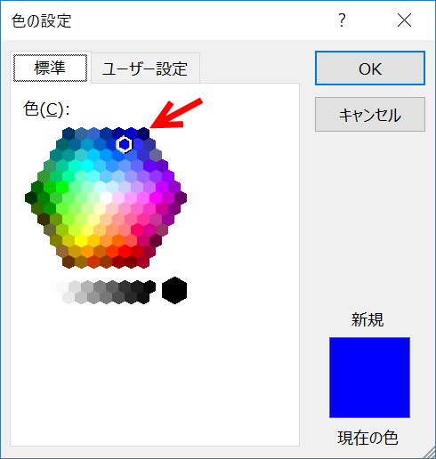 以下のダイアログでは、「青」を指定できません。そこで[その他の色]をクリックします。
