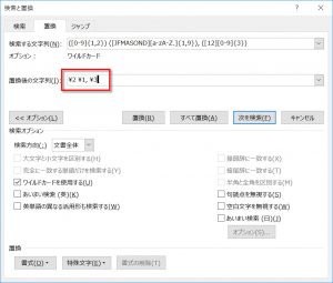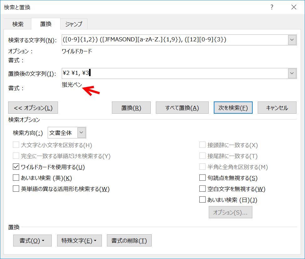ワイルドカード(正規表現)を用いた置換では、置換された文字列を着色することを強くおすすめします。ワイルドカードでは意図しない文字列が置換されてしまうことがあるからです。