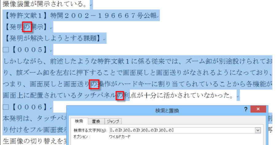 上記以外のサンプルファイル(特許明細書)で試したところ、段落をまたいで選択されてしまい、改行記号(^13)を除外する必要があると発見