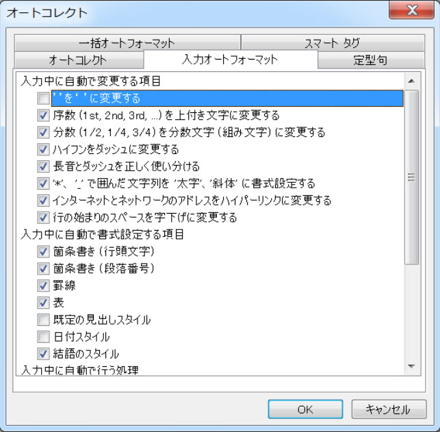確認してみたら、私の自宅のノートパソコンのWord2003のオートコレクトオプションの「入力オートフォーマット」は、すべて「無効」になっていました。