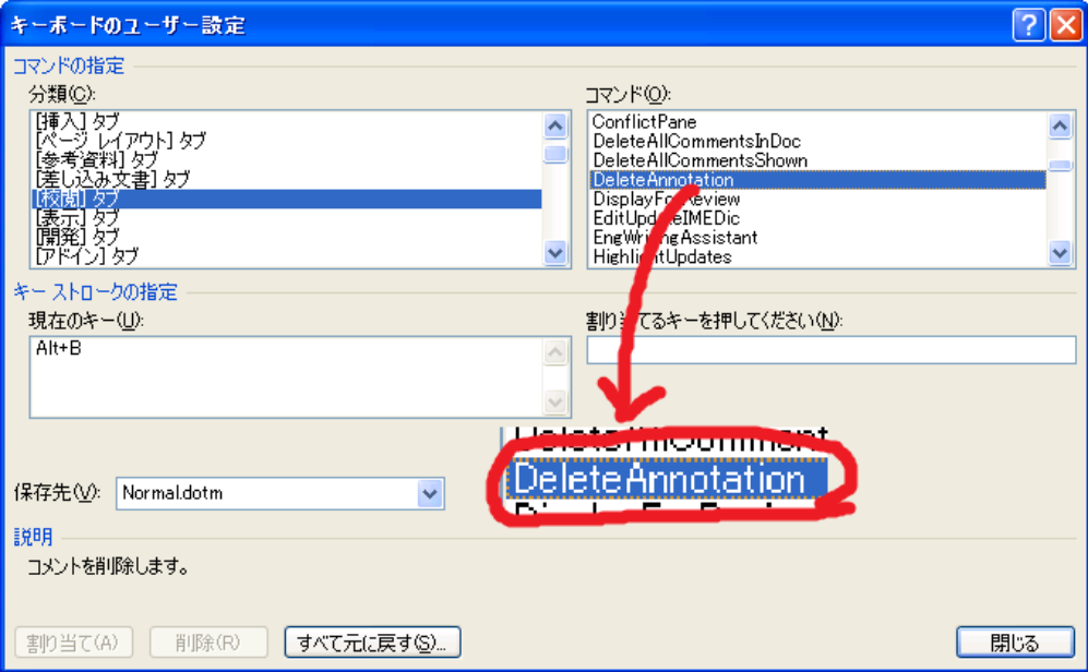 私は、commentとコマンド名に書かれているはずだと思い込んでいたことや、annotationという単語を知らなかったため(汗)、探し出すのに少し時間がかかりました。ただ、Deleteという言葉と組み合わせられているだろうという予測がありましたので、なんとか発見しました。