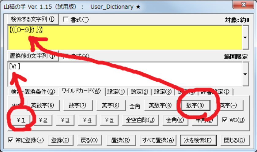 また、「検索と置換」ダイアログボックスの強化版の「山猫の手」を使えば、検索式や置換式の履歴を残しておけますから、あとで編集したりぱらぱらに用いたりするのが簡単です。
