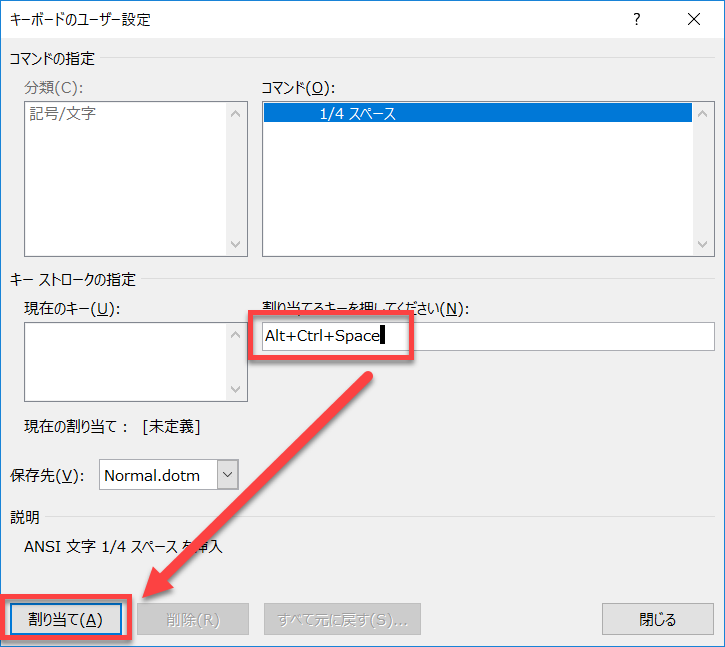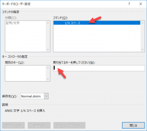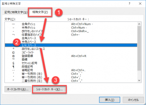 1/4スペースをクリックしてから[ショートカットキー]ボタンをクリックして、ショートカットキーの登録用ダイアログボックスを開きます。