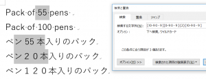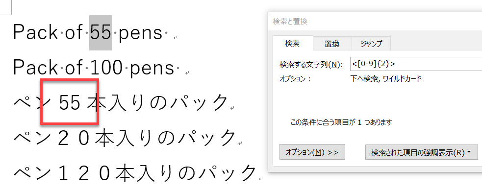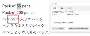 このような理由から、赤枠で示された半角の「55」がヒットしないのです。