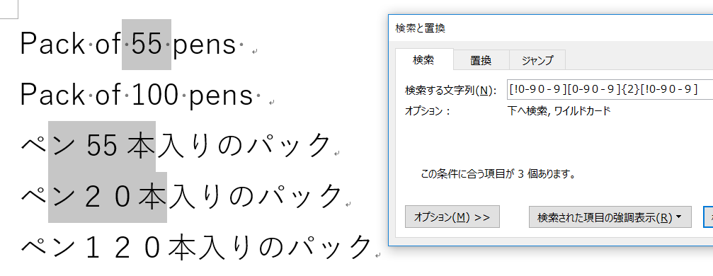 和文の場合には2桁の数字が数字以外の文字列で挟まれている箇所を検索します。