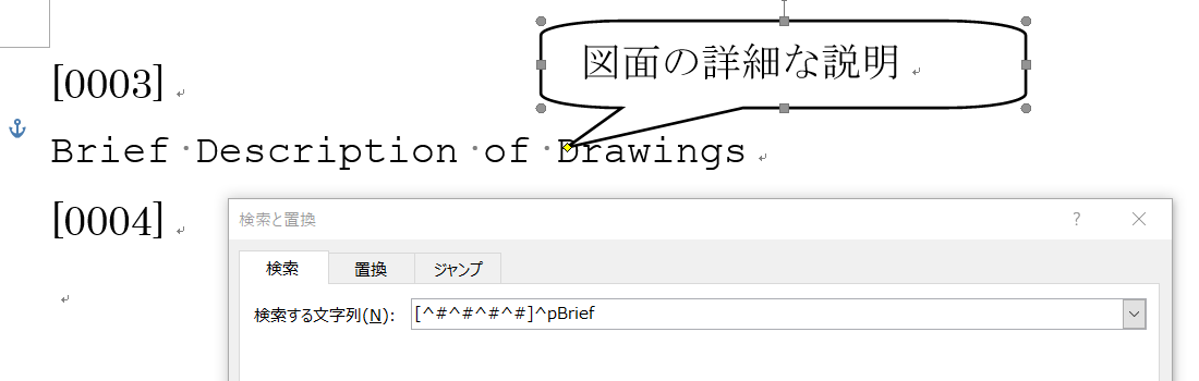 これは、特許明細書の段落番号(半角角括弧で囲まれた4桁数字)の後に改行され、その次にBriefという言葉がある箇所を検索する記述です。